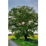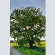 Großer Baum mit dichten Blättern, Sonnenstrahlen scheinen durch die Äste.